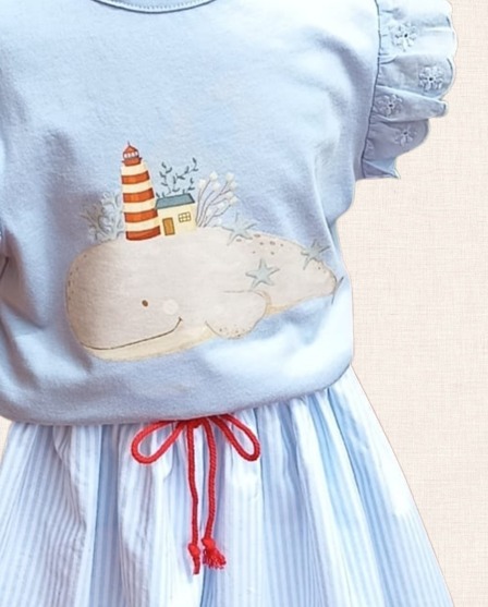 Conjunto diseñado para ofrecer comodidad y estilo. Camiseta en tono celeste con estampado marino y falda de rayas que aporta ligereza y frescura. Ideal para looks veraniegos, paseos o eventos informales.
