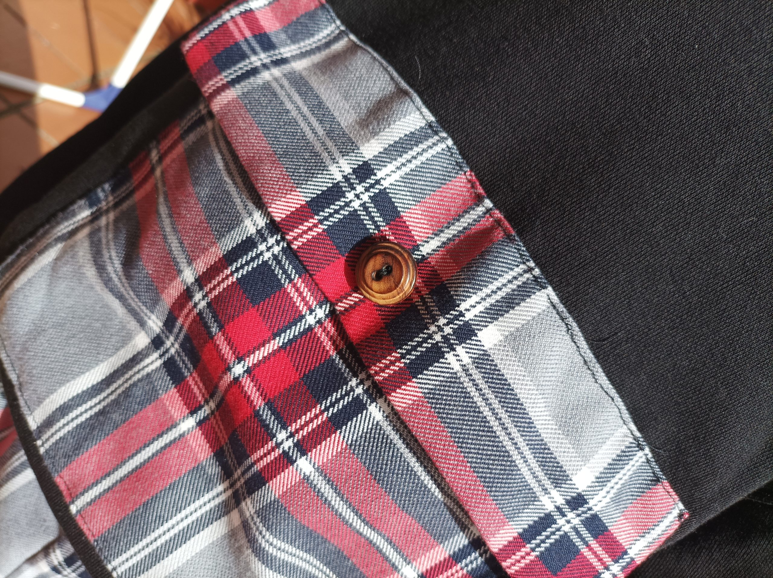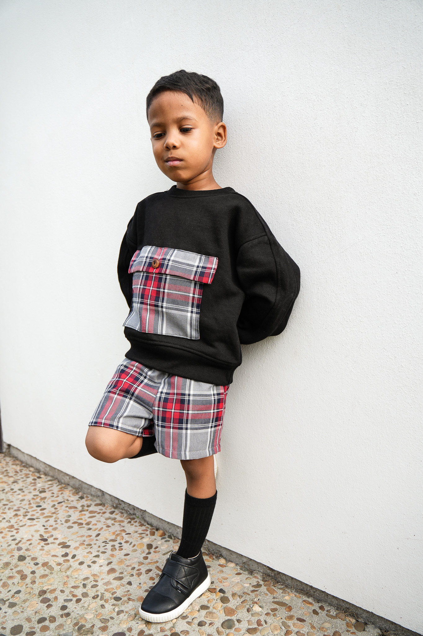 Conjunto de sudadera con bolsito de cuadros rojos y grises y pantalón bermuda a juego.