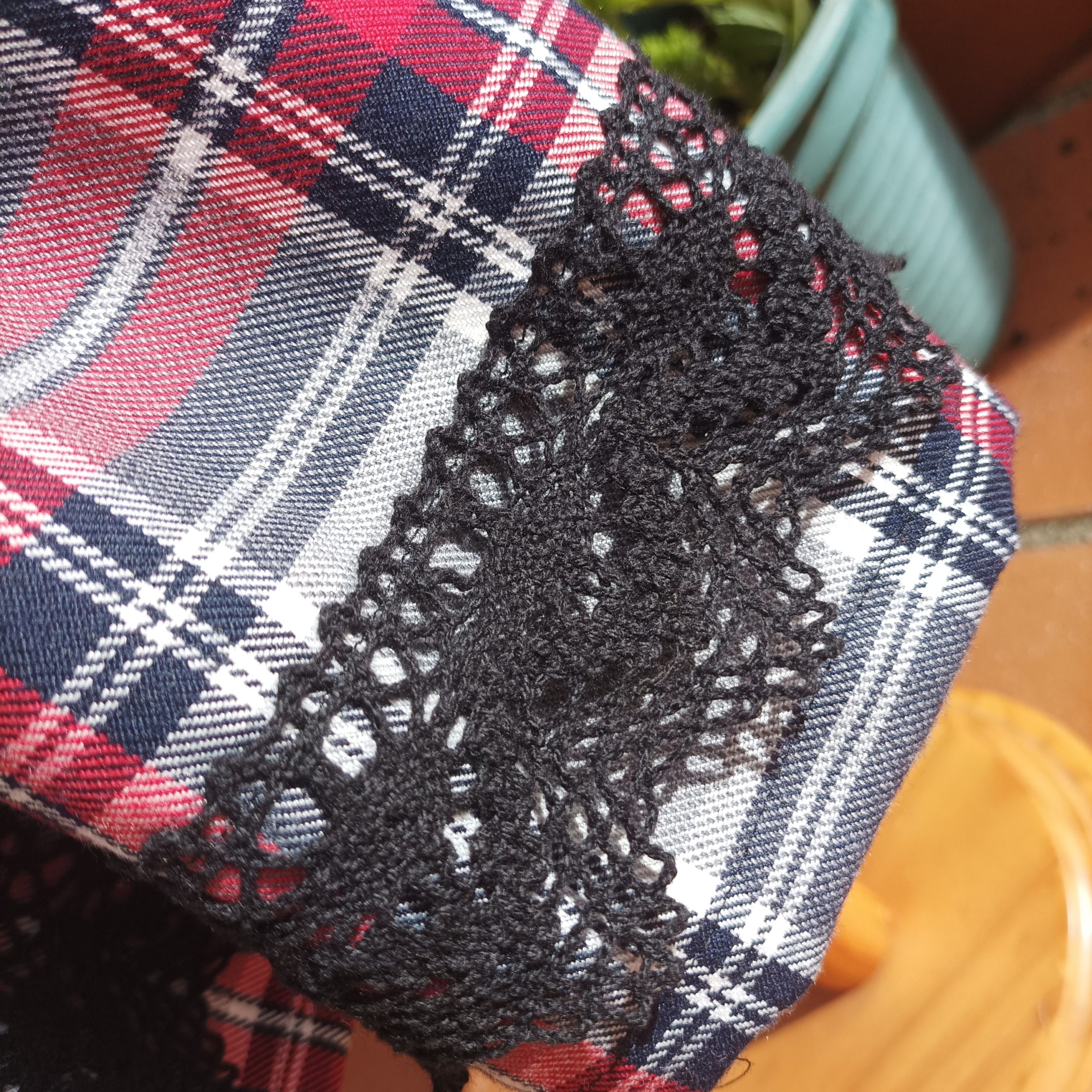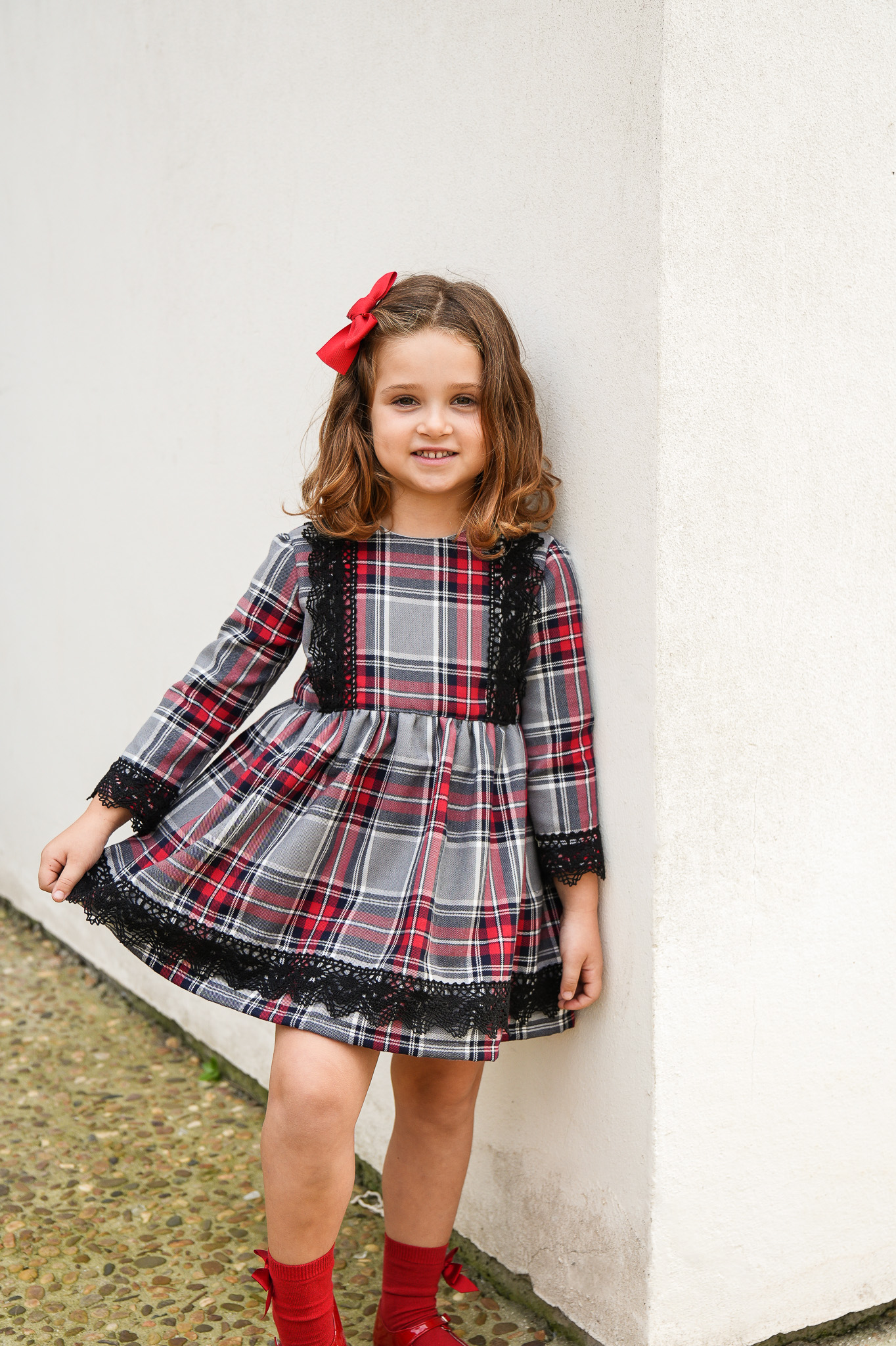 - Elegante vestido de viyela,forrado, en cuadros rojos y grises con adornos de puntilla de hilo en negro.